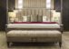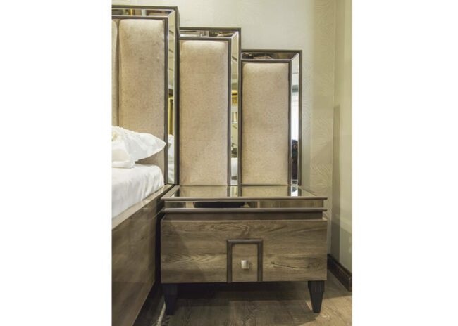 Modern style bed set, made of several kinds of material including laminated boards, MDF, high-pressure laminated moldings, Stainless steel legs, premium fabric for headboard.